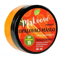 Přírodní mrkvové máslo pro dlouhodobé opálení s vysokým obsahem mrkvového extraktu, beta karotenu a přírodních olejů, chrání pokožku a zabraňuje jejímu stárnutí. Dopřejte své pokožce zdravé, bronzové opálení bez parabenů, umělých barviv a konzervantů. Voděodolné, podporuje zlatavou barvu pokožky. Při nanesení na pokožku se máslo mění v olej a tím se velmi snadno roztírá.