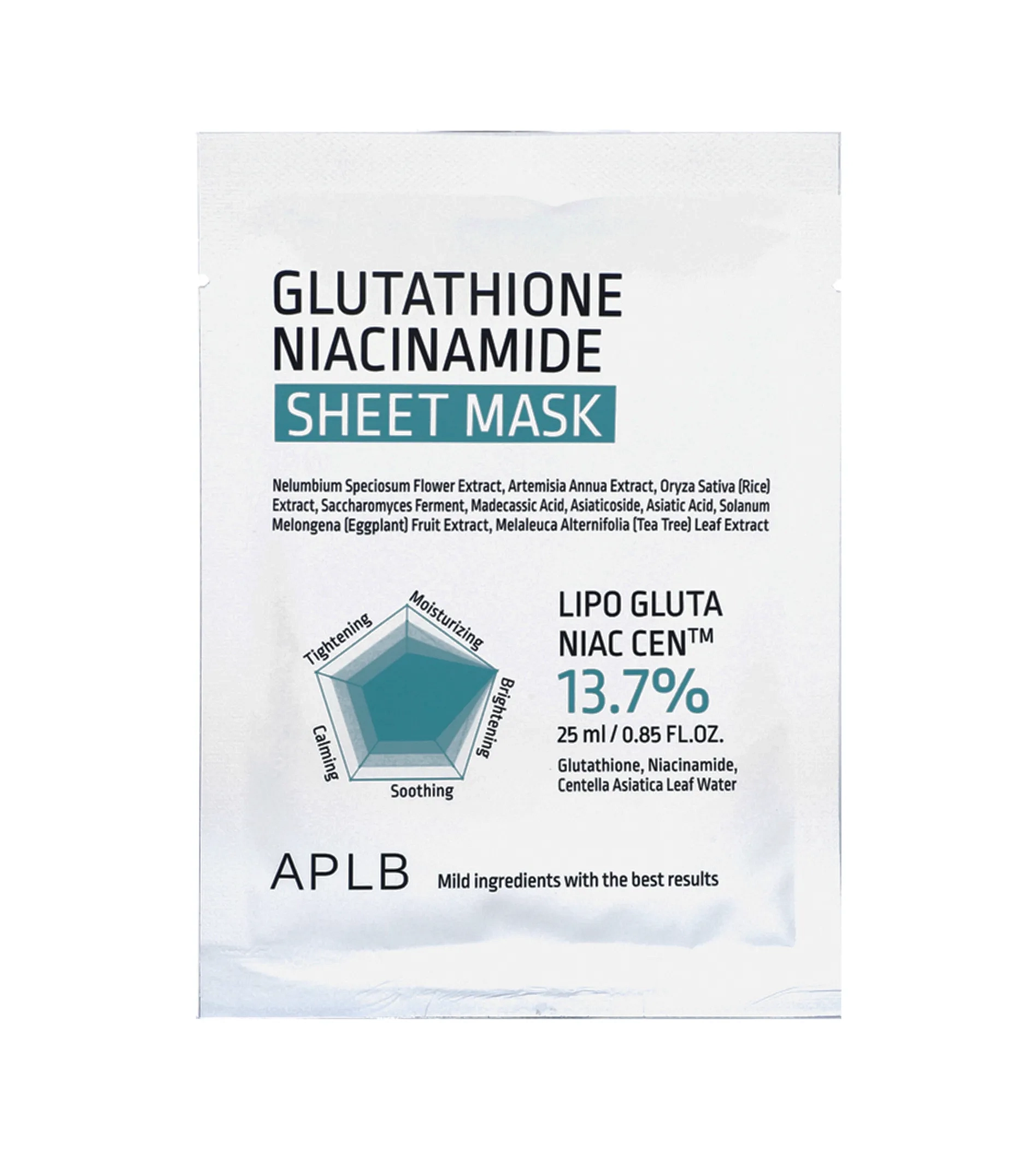 APLB Glutathione Niacinamide Sheet Mask je hydratačně-rozjasňující plátýnková maska, která během krátké chvíle dodá pleti intenzivní výživu, hydrataci a viditelné projasnění. Díky kombinaci glutathionu, niacinamidu a rostlinných extraktů pomáhá sjednotit tón pleti, zklidnit podráždění a zanechává pokožku svěží, jemnou a zdravě rozzářenou.