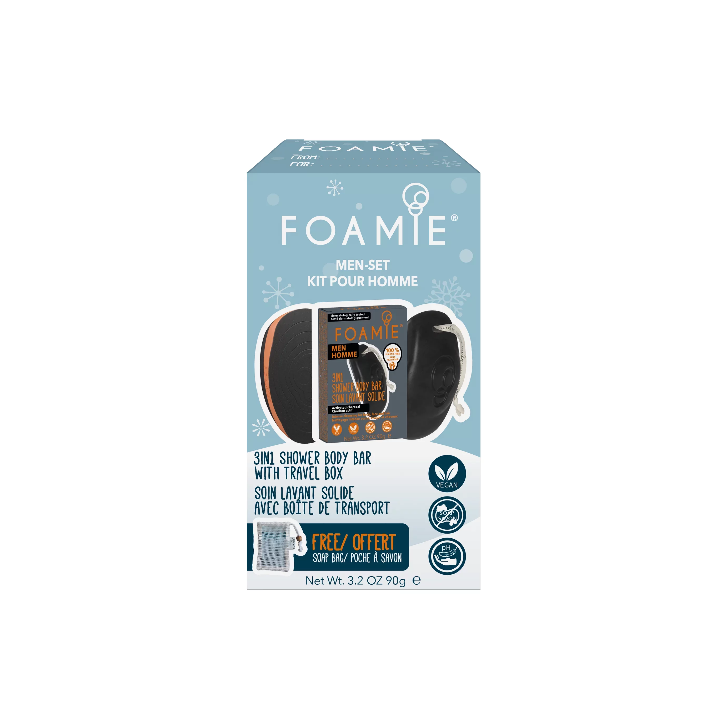 Vianočný limitovaný Starter set Body Men. Obsah: Sprchová starostlivosť Foamie Men 3v1, Travel Buddy box.