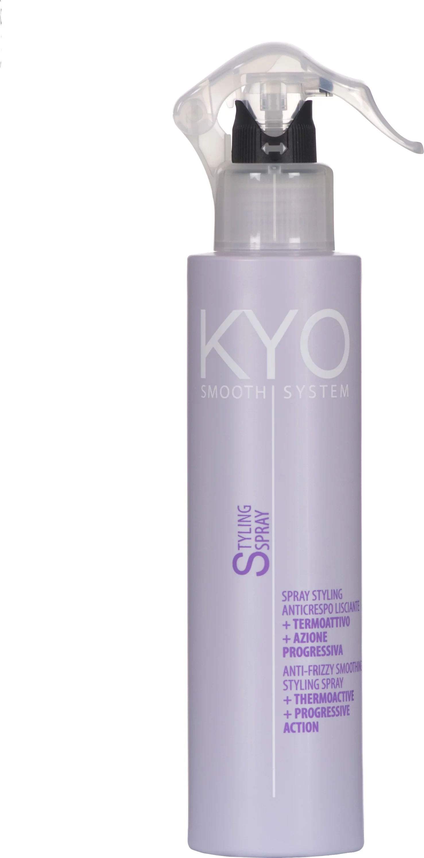 KYO stylingový sprej. SMOOTHSYSTEM uhlazující sprej proti krepatosti, který se aplikuje teplem, uhlazuje vlasy postupným používáním a při kontaktu s teplem posiluje strukturu vlasu a restrukturuje mechanickým ošetřením zničené vlasy. Zklidňuje, zrychluje použití fénu a žehliček a dodává jemnost a pružnost vlasu. Chrání před vlhkostí a vnějšími vlivy.