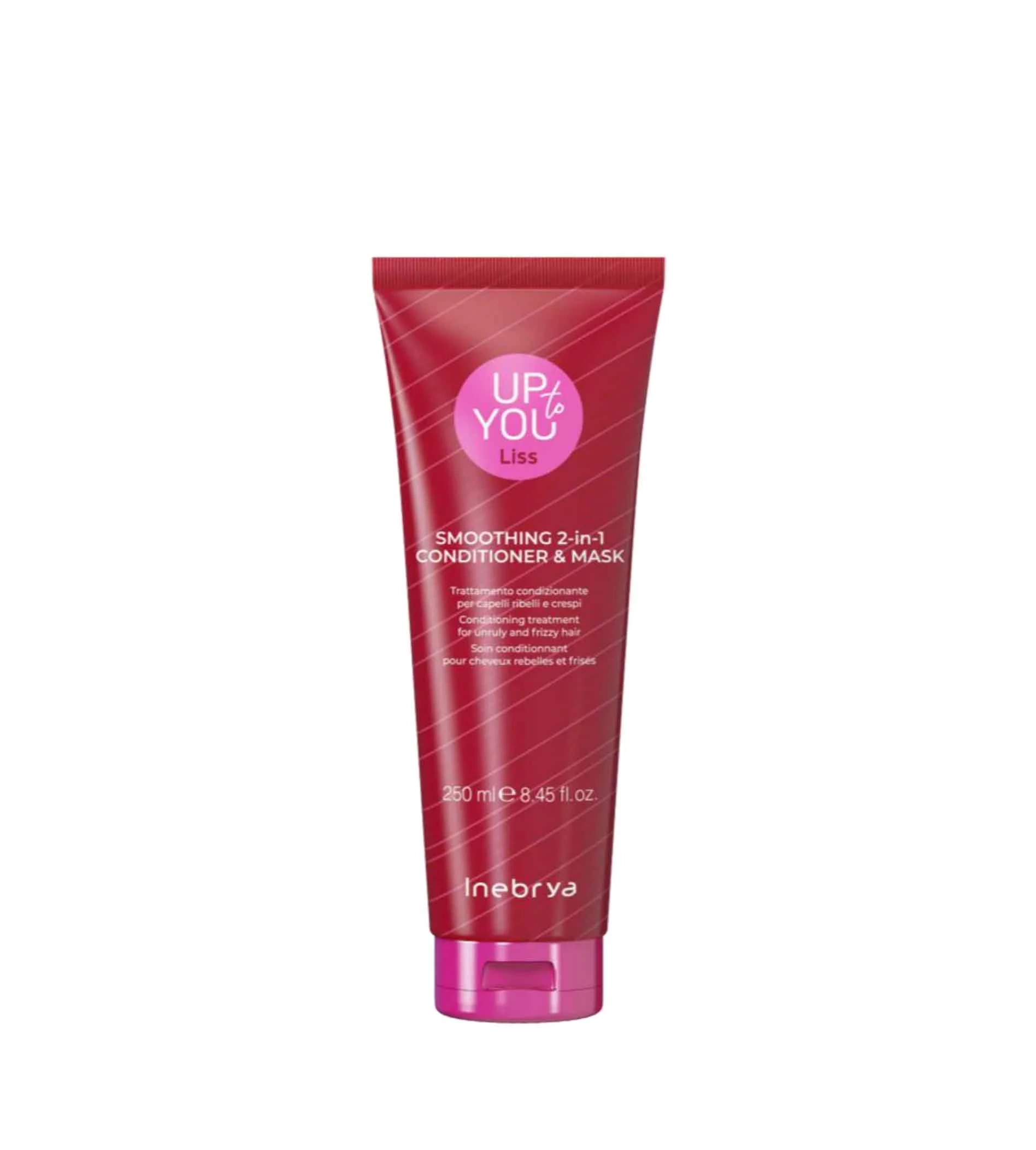 Inebrya Up To You Liss Smoothing 2-in-1 Mask & Conditioner je inovativní produkt, který kombinuje výhody kondicionéru a masky v jednom. Jeho složení s vitaminy A, E, C a výtažkem z malin poskytuje vlasům intenzivní hydrataci a výživu. Produkt zlepšuje ovladatelnost vlasů, usnadňuje rozčesávání a bojuje proti krepatění. Zajišťuje dlouhotrvající hladkost a ochranu před vlhkostí, aniž by vlasy zatěžoval.