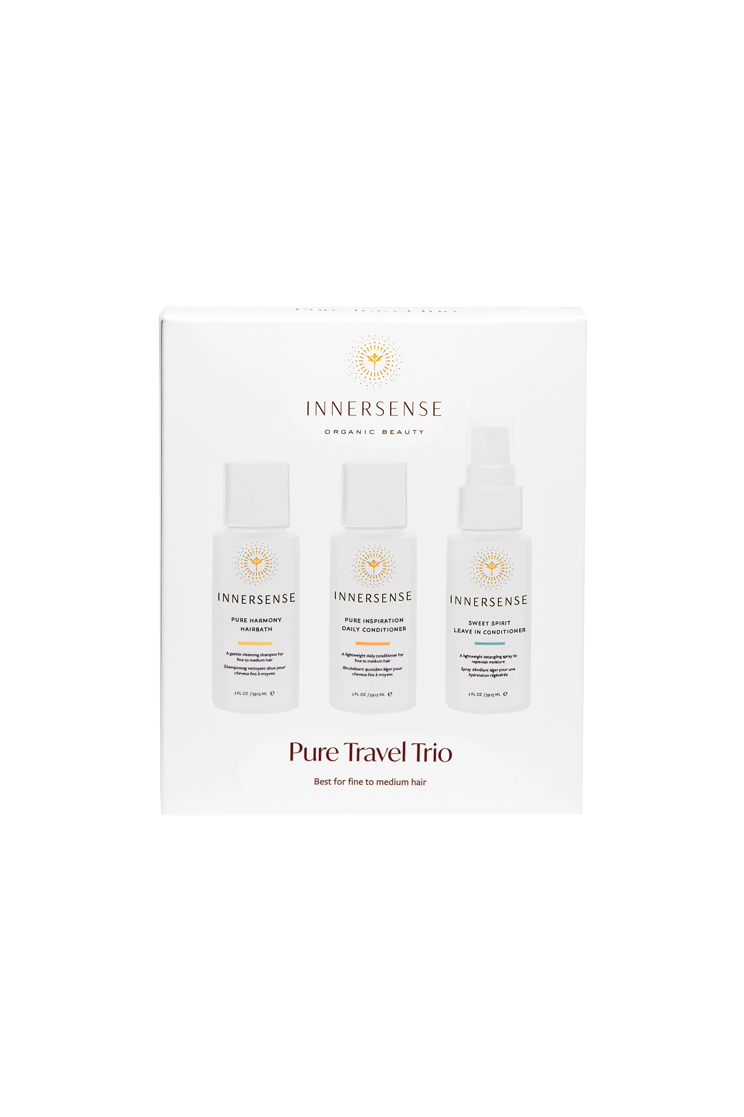 INNERSENSE The Pure Trio Collection je luxusní sada přírodní vlasové péče, která čistí, hydratuje a vyživuje vlasy od kořínků až po konečky. Obsahuje tři klíčové produkty – šampon, kondicionér a vyživující pěnu – s organickými ingrediencemi, které obnovují rovnováhu vlasů a pokožky hlavy. Díky šetrnému složení bez sulfátů, silikonů a syntetických látek je sada vhodná pro všechny typy vlasů, včetně jemných a barvených.