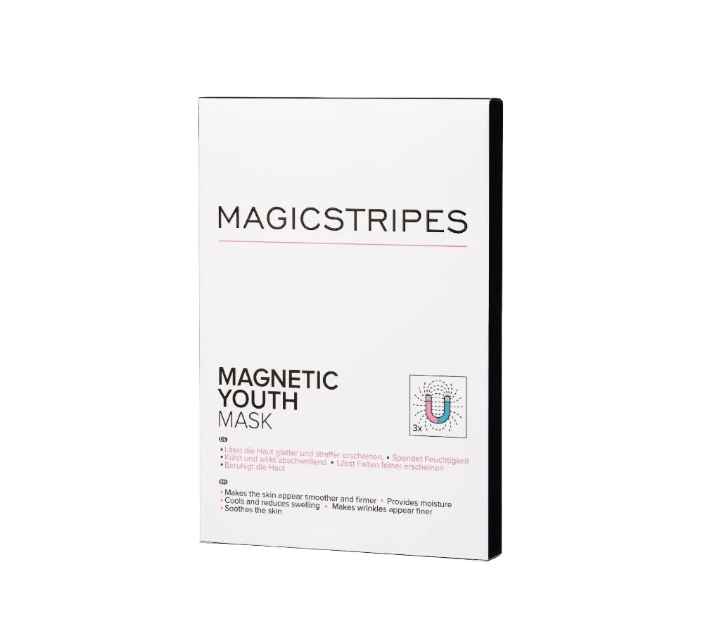 Magicstripes Magnetic Youth Mask je inovativní pleťová maska s magnetickými částečkami, která působí proti známkám stárnutí a podporuje regeneraci pokožky. Magnetická technologie stimuluje mikrocirkulaci, zlepšuje okysličení pleti a pomáhá odstraňovat nečistoty i toxiny. Díky kombinaci minerálů, vitamínů a pečujících složek zanechává pleť hebkou, svěží a viditelně mladší. Praktické balení Box obsahuje více masek, ideální pro pravidelnou omlazující kúru.