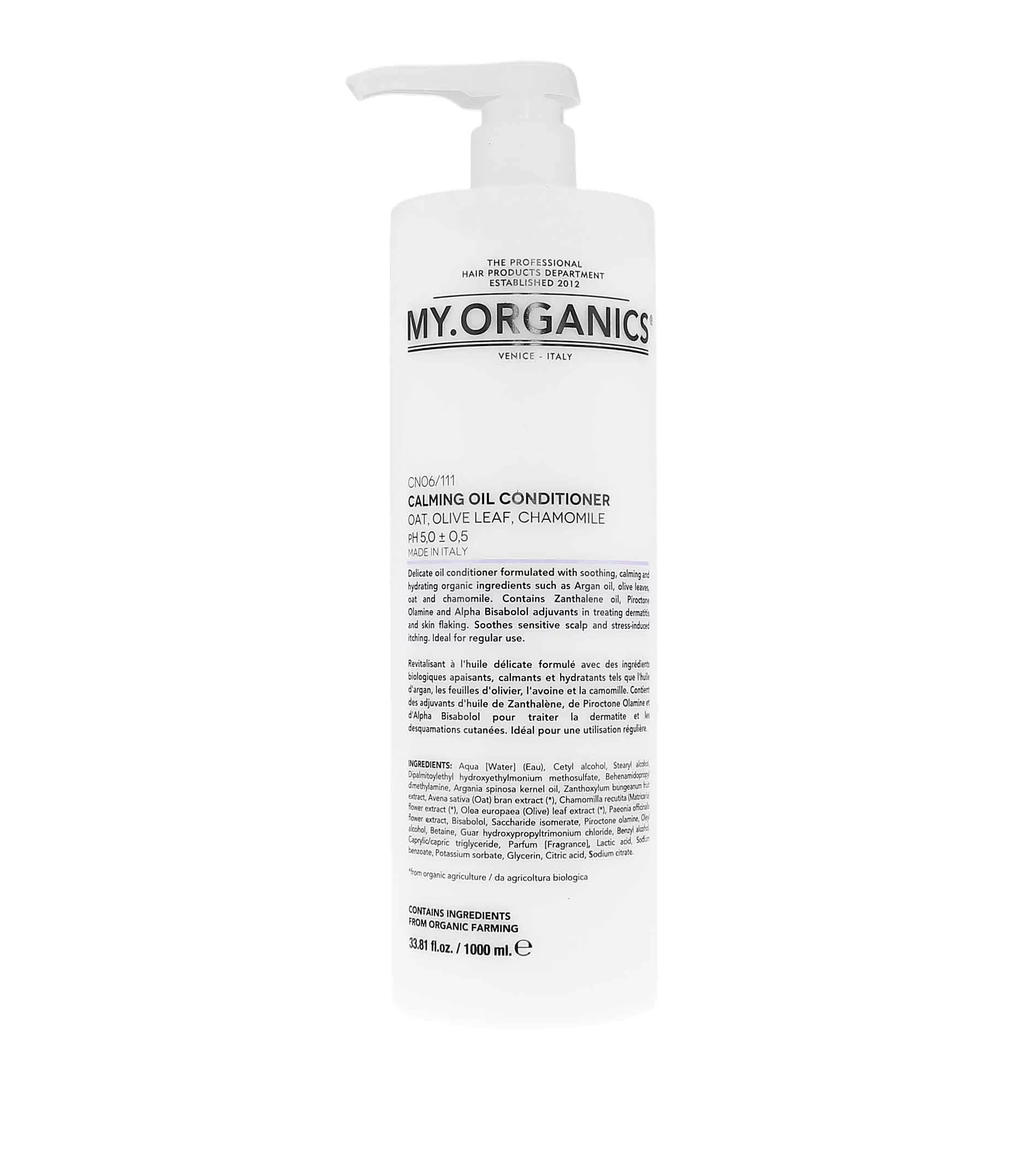 My.Organics Calming Oil Conditioner 250 ml je jemný kondicionér s uklidňujícím účinkem, ideální pro citlivou a podrážděnou pokožku hlavy. Obsahuje organické složky jako arganový olej, extrakt z olivových listů, oves a heřmánek, které hydratují a zklidňují pokožku. Díky přítomnosti Zanthalene, Piroctone Olamine a Alpha Bisabololu pomáhá při léčbě dermatitidy a olupování kůže.