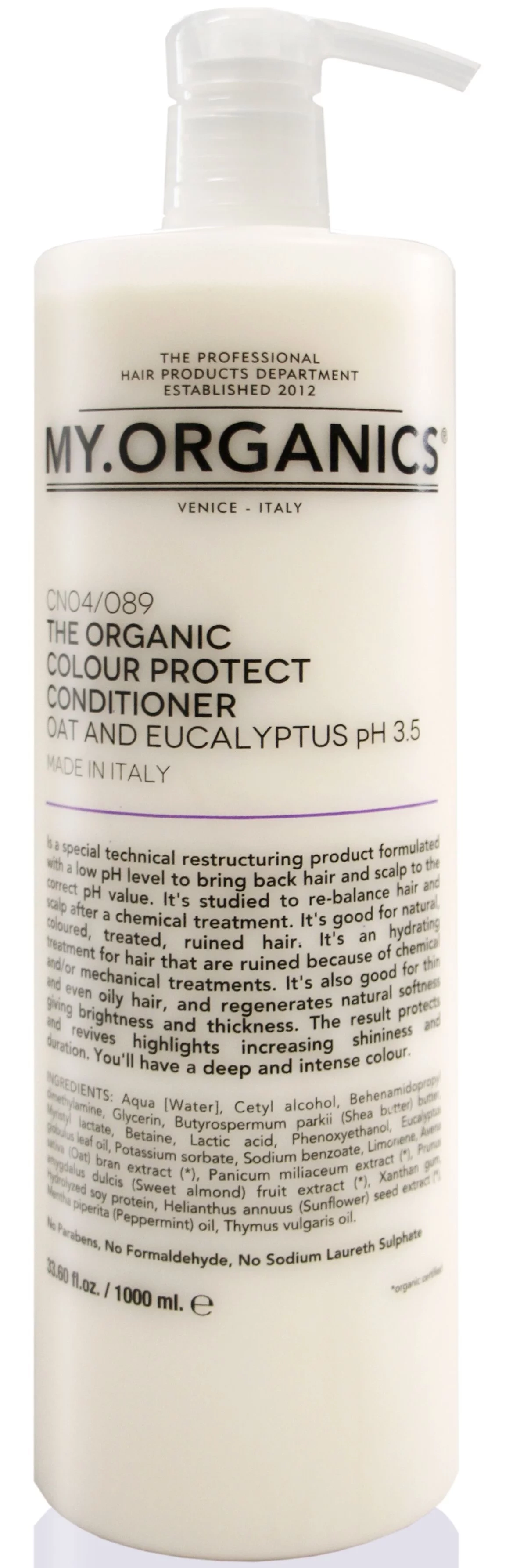 Kondicionér pre farbené vlasy MY.ORGANICS The Organické Colour Protect Conditioner Oat And Eucalyptus. Špeciálny technický produkt s nízkou hodnotou pH, aby sa kyslosť vlasov a vlasovej pokožky vrátila do správnych hodnôt. Vyvinutý špeciálne na ošetrenie vlasovej pokožky a vlasov po chemických úpravách. Vynikajúci na prírodné, farbené, chemicky ošetrené, poškodené alebo melírované vlasy. Poskytuje dokonalú hydratačnú starostlivosť poškodeným vlasom, oslabeným po chemických alebo mechanických úpravách. Skvele poslúži aj pri jemných, zľahnutých a dokonca aj mastných vlasoch, ktoré majú tendenciu k ťaženiu – dodá im prirodzenú hebkosť, zvýši lesk a objem. Výsledok, ktorý chráni a dodáva vitalitu farebným odleskom vlasov s väčšou žiarivosťou po dlhšiu dobu. Hlbové a intenzívne farby.