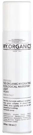 Ekologický sprej na vlasy s ľahkou fixáciou MY.ORGANICS The Organic Hydrating Ecological Hairspray Light Argan poskytuje účesu fixáciu bez zaťaženia, dodáva objem. Nezanecháva zvyšky, rýchlo schne a ľahko sa vyčesáva pomocou kefy. Sprej šetrný k životnému prostrediu