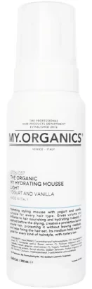Stylingová hydratačná pena s ľahkou fixáciou MY.ORGANICS The Organické My Hydrating Mousse Light Yogurt a Vanilla na báze jogurtu a vanilky, ideálny pre všetky typy vlasov. Dodáva objem a žiarivý lesk vlasom, ktoré hĺbkovo hydratuje a vyživuje. Pri aplikácii pred fúkaním vlasov vytvára ochrannú bariéru na povrchu vlasov a chráni ich tak pred účinkom horúceho vzduchu bez toho, aby zanechávala zvyšky, a pomáha fixovať účes. Vďaka svojej stredne silnej fixačnej schopnosti je vhodná pre všetky typy účesov, vrátane účesov s natáčkami.