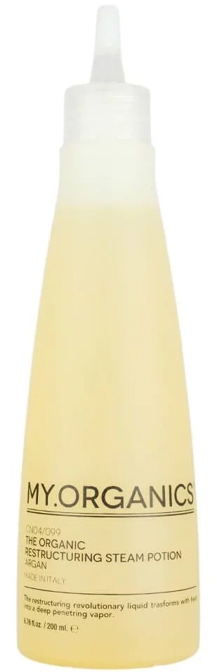 Produktový rad MY.ORGANICS Restructuring je určená na starostlivosť o veľmi suché a chemicky upravované vlasy. Hĺbkovo vyživuje vlasové vlákno a pokožku hlavy, obnovuje správnu hydratáciu a odstraňuje matný vzhľad spôsobený suchosťou. Termoaktívny aerosól MY.ORGANICS The Organic Restructuring Steam Potion Argan je revolučný produkt, ktorý sa pôsobením tepla mení na paru a preniká do hĺbky vlasového vlákna pomocou novej technológie HG. Účinné prírodné zložky: Arganový olej - získavaný z nepražených jadierok argánie, vďaka čomu si uchováva svoje blahodárne účinky. Pomáha regenerovať, obnovovať vitalitu, posilňovať, hydratovať a dodávať brilantný lesk každému typu vlasov. Okolo vlasu vytvára ochrannú bariéru, čím predchádza padaniu a podporuje rast vlasov.