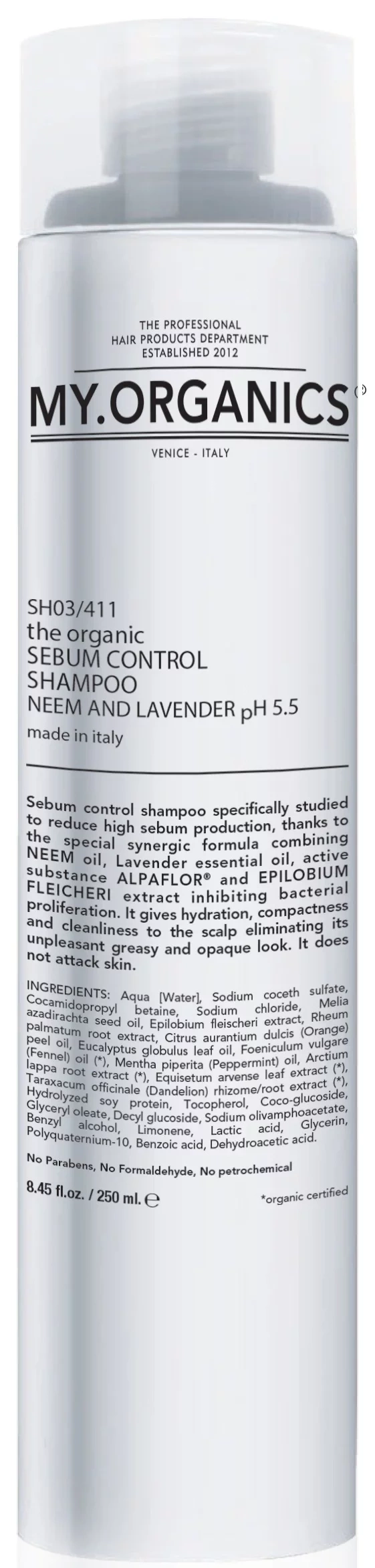 Šampón MY.ORGANICS The Organic Sebum Control Shampoo Neem And Lavender vyvinutý špeciálne za účelom znižovania zvýšenej produkcie mazu, vďaka účinnej kombinácii zložiek ako je nimbový olej, esenciálny olej z levandule, účinná látka ALPAFLOR® a výťažok z EPILOBIUM FISCHERI, ktorý zabraňuje šíreniu baktérií. Dodáva vlasovej pokožke hydratáciu, celistvosť a čistotu a odstraňuje nepríjemný mastný a matný vzhľad. Nedráždi pokožku.