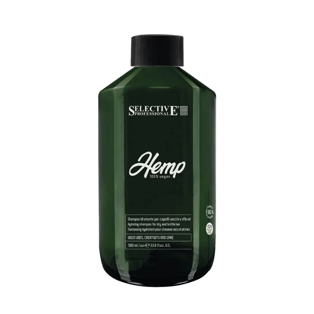 SELECTIVE HEMP 100% VEGAN SHAMPOO je přírodní, veganský šampon obohacený o konopný olej, který intenzivně vyživuje, hydratuje a posiluje vlasy. Je vhodný pro všechny typy vlasů, včetně suchých a namáhaných. Jemně čistí vlasovou pokožku, obnovuje přirozenou rovnováhu a dodává vlasům zdravý lesk.
