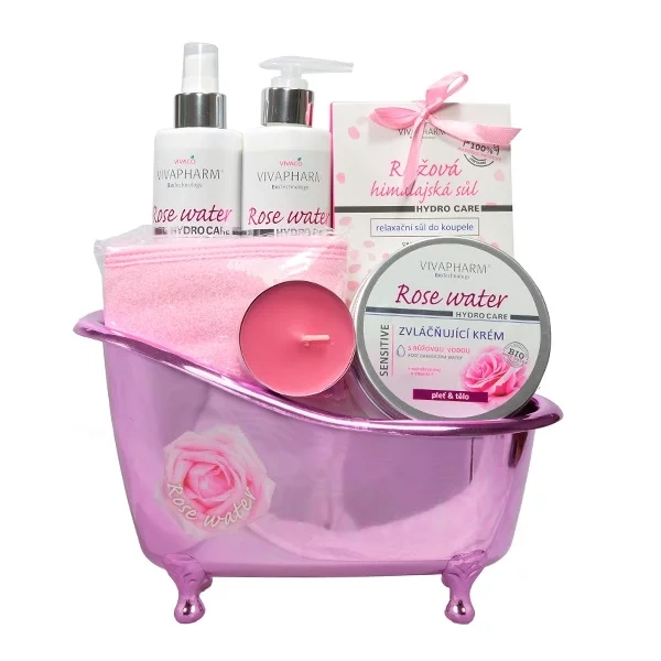 Krásné dárkové balení hydratační péče s růžovou vodou v dekorativní vaničce.