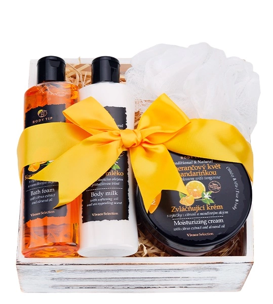 Dárkové balení kosmetiky s výtažky z citrusů a mandlovým olejem ve stylové dřevěné bedýnce je tím pravým dárkem pro Vás a Vaše blízké.
