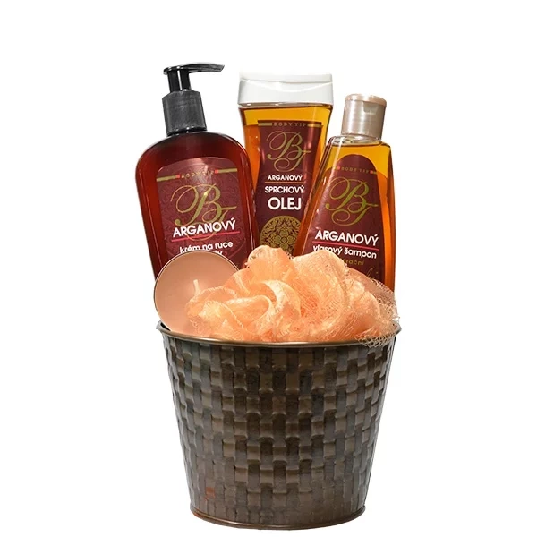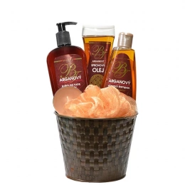 Dárkové balení kosmetiky s bio arganovým olejem pro péči o pokožku těla i obličeje v dekorativním plechovém obalu.
