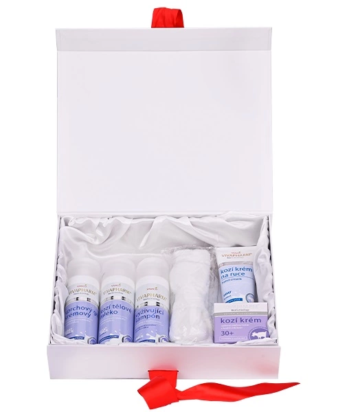 Luxusní balení kosmetiky s kozím mlékem pro péči o pokožku těla i obličeje ve velkém dárkovém boxu.