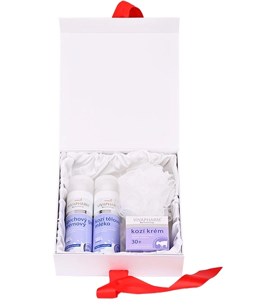 Dárkové balení kosmetiky s kozím mlékem pro péči o pokožku těla i obličeje v dekorativním papírovém boxu.