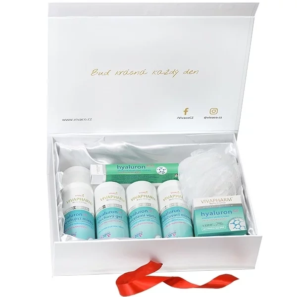 Darčekové balenie hydratačnej starostlivosti s kyselinou hyalurónovou zaisťujúcou omladenie a hydratáciu pleti a pokožky. Obsahuje nízkomolekulárnu kyselinu hyalurónovú, ktorá sa nazýva molekula mladosti, pre svoju prirodzenú schopnosť zachovávať v pleti optimálny stupeň hydratácie. Kyselina hyaluronová napomáha udržovať pokožku pevnú, viaže na seba vodu a tým pomáha vyhladzovať vrásky a drobné linky, urýchľuje obnovu tkaniva, pleť regeneruje a vypína.