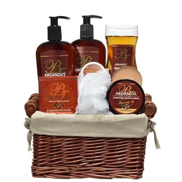 Darčekové balenie kozmetiky s bio arganovým olejom na starostlivosť o pokožku tela i tváre v krásnom prútenom koši.