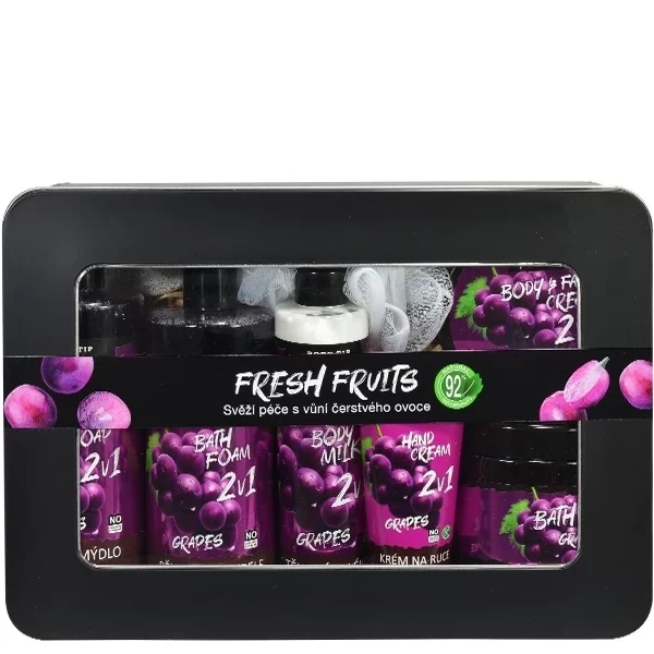 Darčekové balenie kozmetiky s výťažkami z hrozna na každodennú starostlivosť o pokožku a pleť v darčekovom plechovom obale. Svieža ovocná vôňa oživuje myseľ a dodáva pocit sviežosti po celý deň.