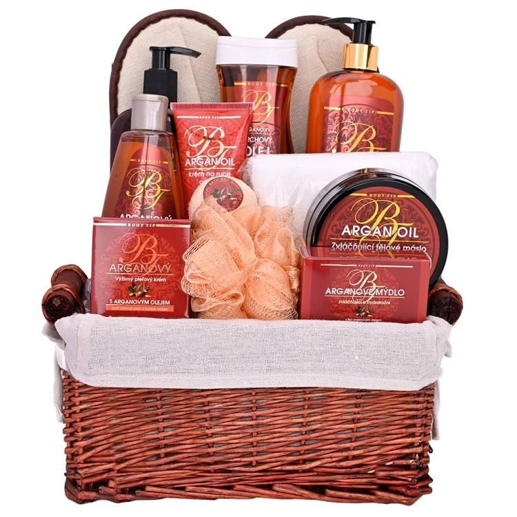Luxusní dárkové balení kosmetiky s bio arganovým olejem pro péči o pokožku těla i obličeje v krásném dekorativním proutěném koši.